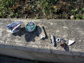 I did pick up these bits of junk. Not really sharp, but who needs this trash to wash into the lake.